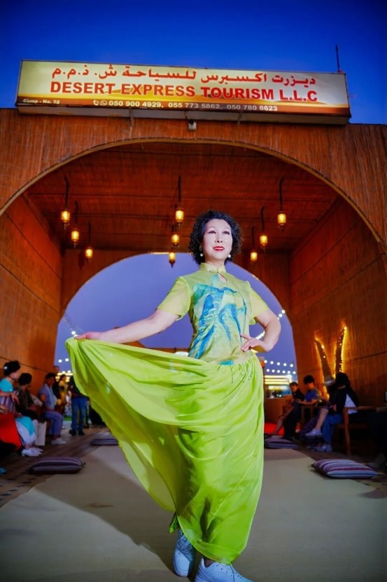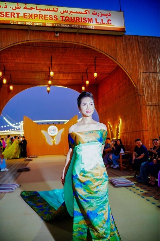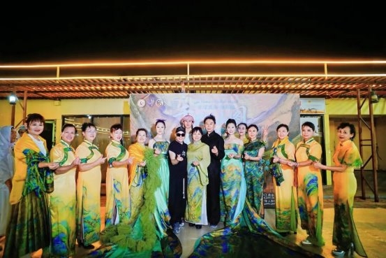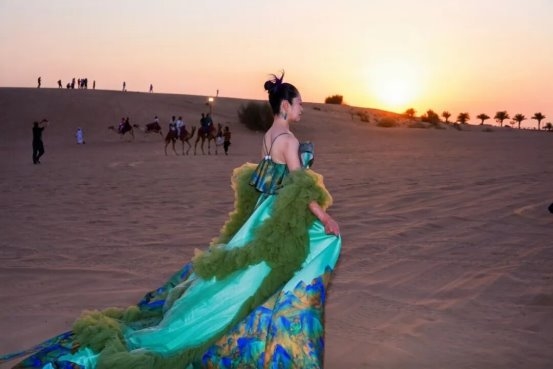 随后,一场以“青山远黛·千里江山图”为主题的非遗时尚大秀在沙漠日落中惊艳上演。模特们身着独一无二的原创万古旗袍非遗设计,行走于沙丘与骆驼之间,将中国古典山水意境与迪拜壮丽的大漠风光完美融合。整场大秀不仅呈现了中华传统服饰的精湛工艺,更以“行走的山水”为理念,传递出东方美学与沙漠情怀的和谐共鸣。