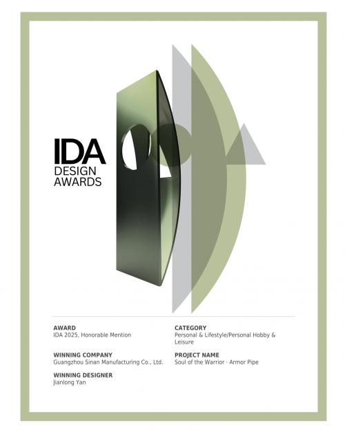 2025年美国IDA国际设计大奖(International Design Awards)获奖名单近日揭晓,广州司南制造(COMPASS)旗下00后设计师严建龙的作品《将魂·甲胄烟斗》(Soul of the Warrior · Armor Pipe)从全球众多参赛作品中脱颖而出,荣获荣誉奖(Honorable Mention)。