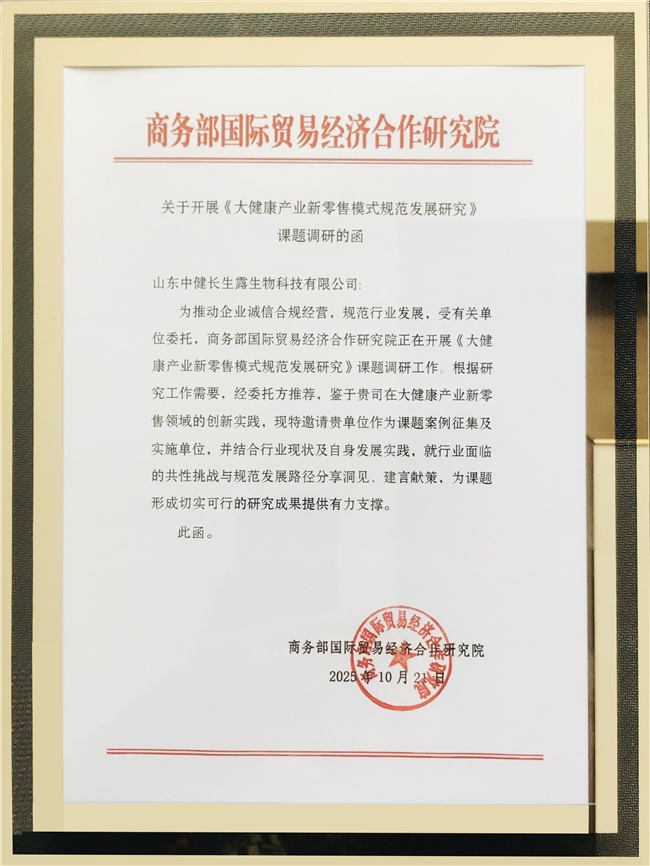 近日,山东中健长生露生物科技有限公司的创新销售模式成功入选商务部国际贸易经济合作研究院(简称商务部研究院)课题研究案例,这一认证不仅彰显了企业在大健康领域的创新实力,更借助国家级高端智库的权威背书,为其全球化发展战略奠定了坚实基础。