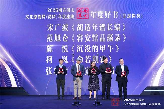 5本非虚构图书《胡适年谱长编》《容安馆品藻录》《沉没的甲午》《命若朝霜》《陈寅恪四书》,让史料和文献以鲜活的方式与读者相见,重塑历史与当代的对话。南方周末党委副书记、主编肖华在致敬发言中称这些作品“深入了历史的褶皱和知识分子的心灵”。