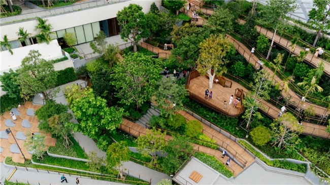 项目中最具标志性的公共空间之一,是向公众开放的 Dusit Arun Park。这是一座位于综合体上方的大型空中公园,占地逾万平方米,是泰国规模最大的城市屋顶公园。公园整体以“城市绿洲”为理念,规划了多条步行路径、观景平台、草坪与休憩空间,并通过大量热带植物景观,弱化高密度城市带来的压迫感。依托立体景观设计,公园将城市、自然与人重新连接在一起。